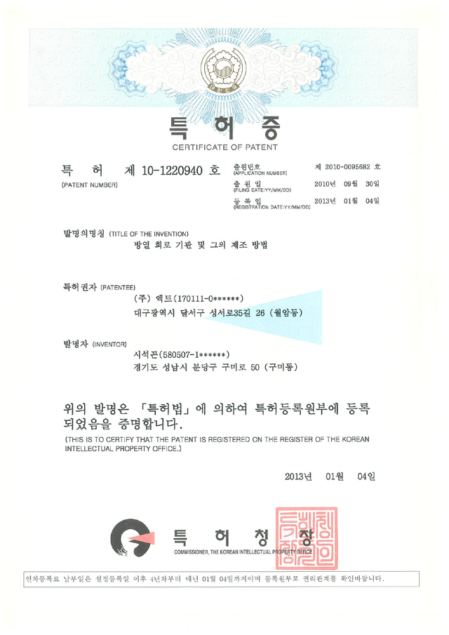 | 10-1066835 | korea | Heat dissipation circuit board and manufacturing method thereof |