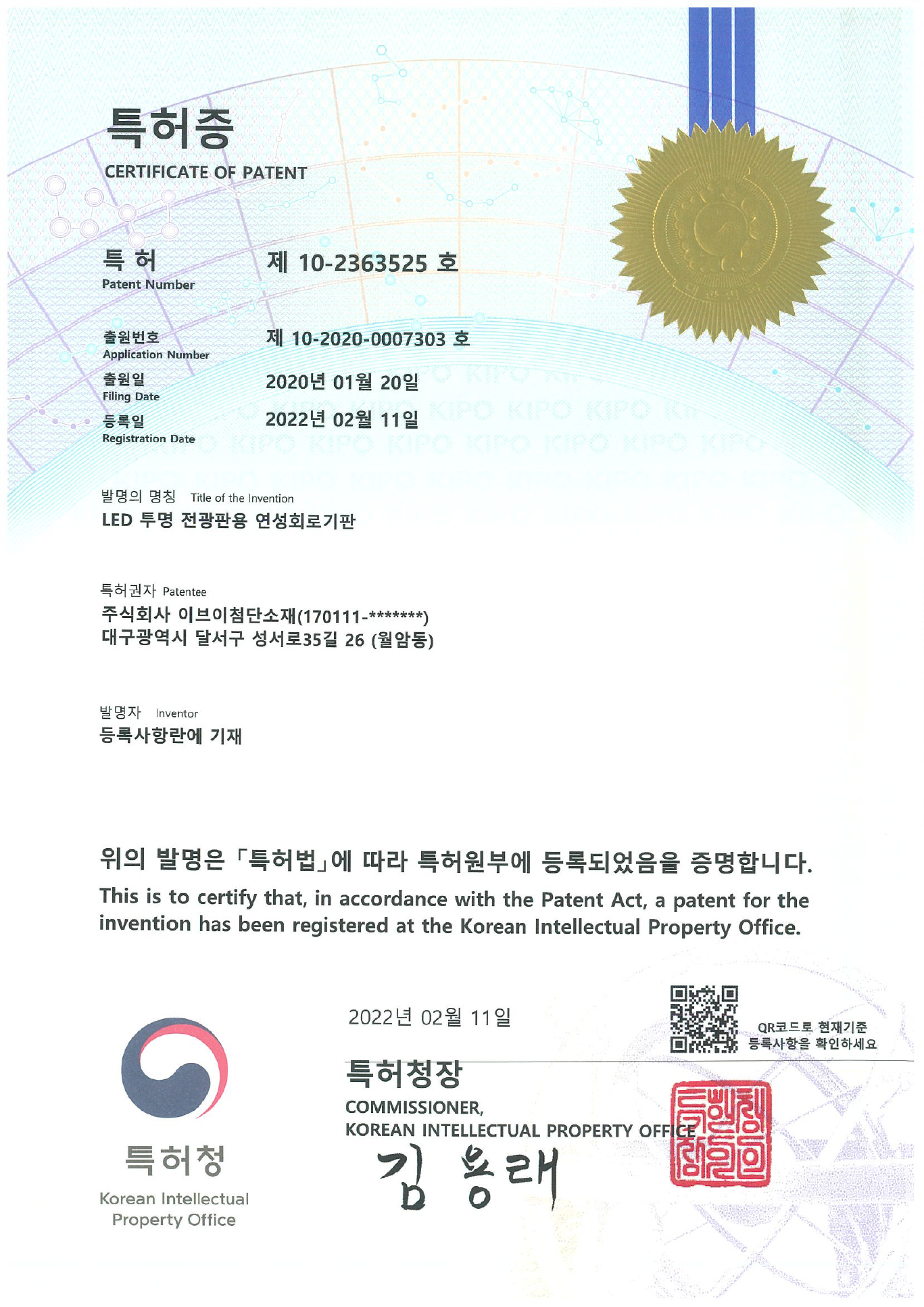 | 10-2363525 | korea | Patent design patent to complement IC LED technology applied to transparent LED film |