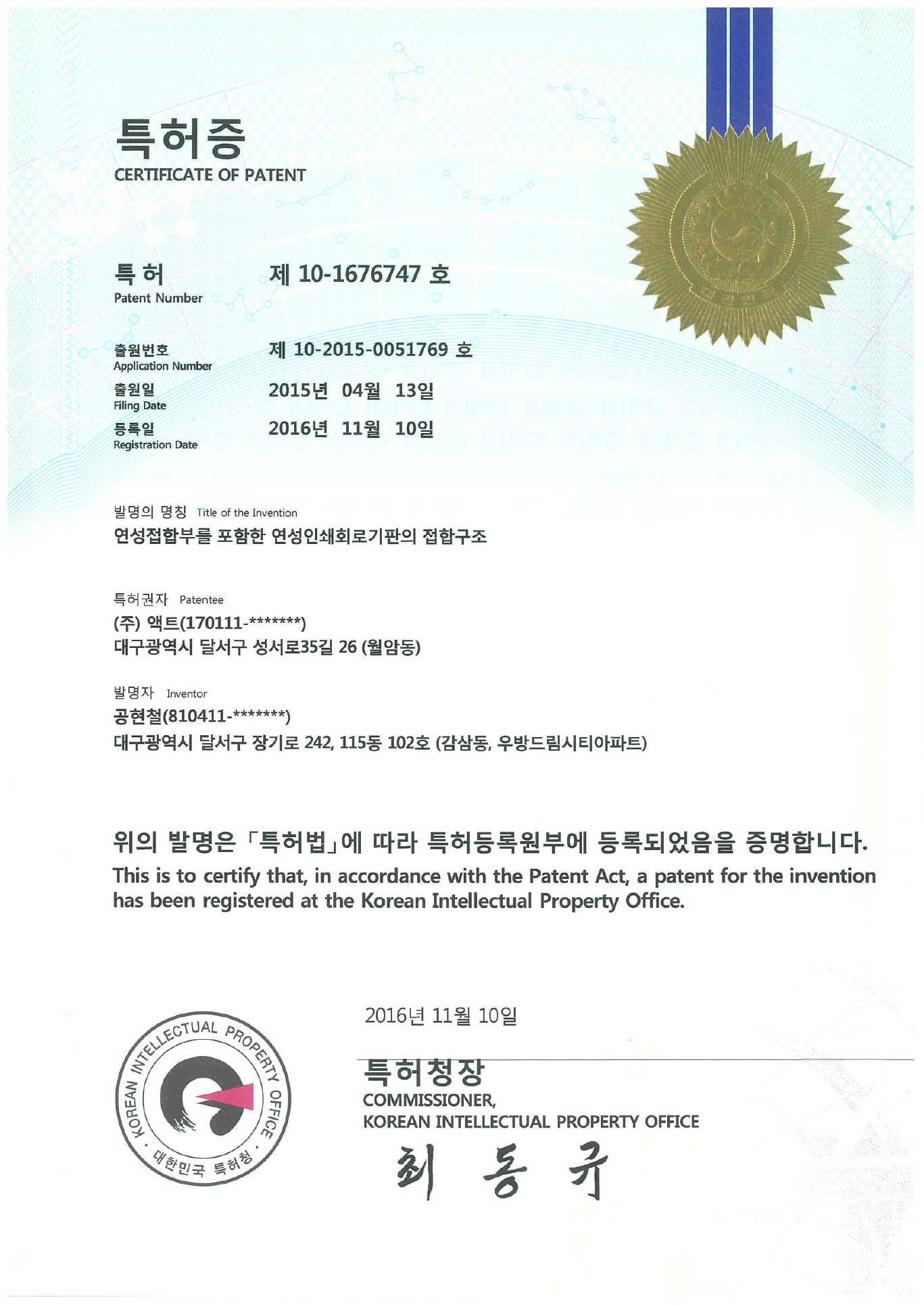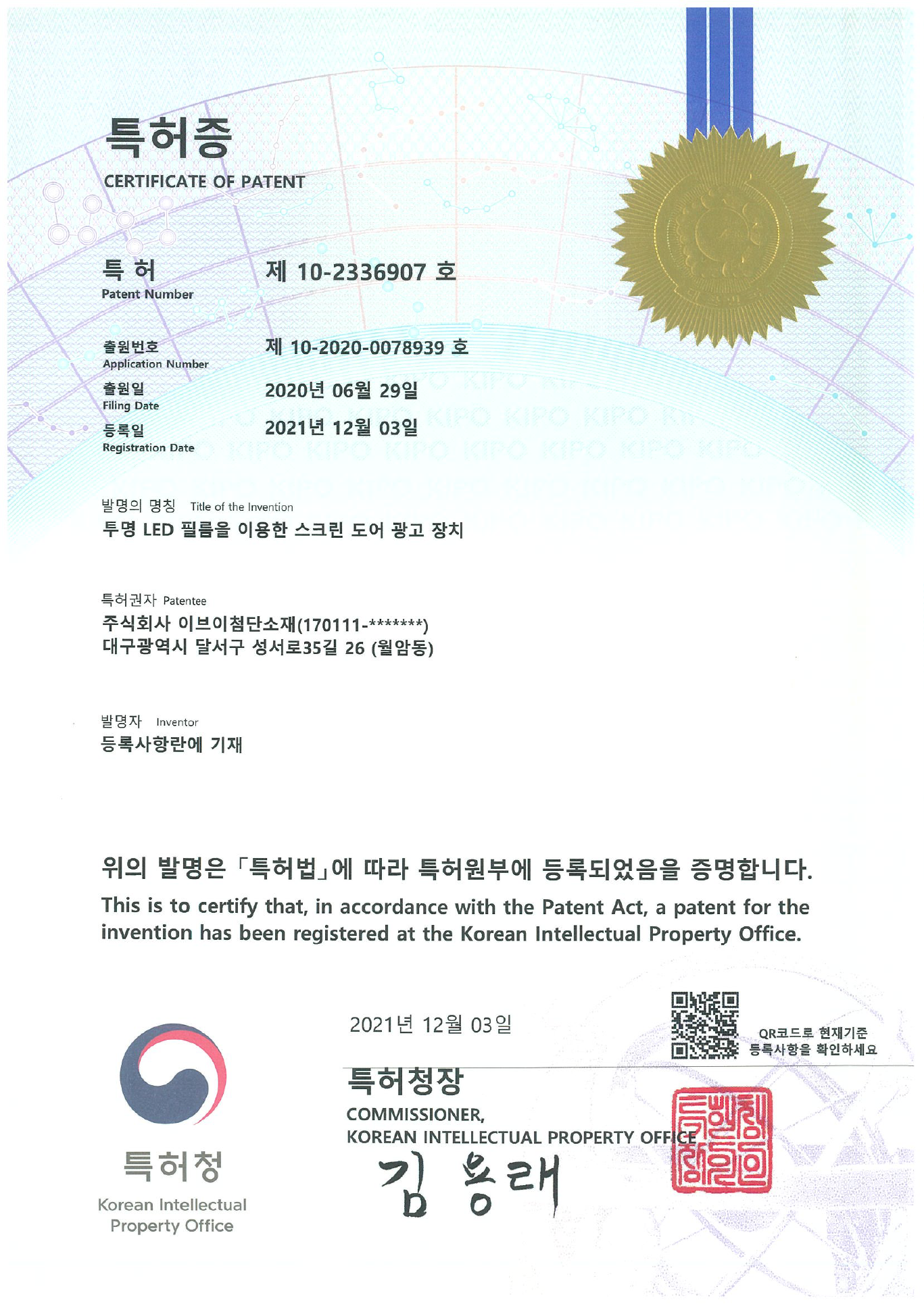 | 10-2027416 | korea | Glass window reverse attachment technology through development of transparent LED film structure |